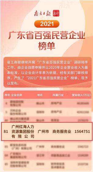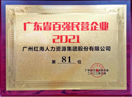 近日,廣東省工商聯(lián)(總商會)在廣州召開十二屆七次執(zhí)委會議。會上正式發(fā)布“2021年廣東省百強民營企業(yè)”榜單,紅海人力集團位列第81名,連續(xù)三年榮登“廣東省百強民營企業(yè)”榜單。