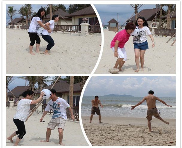 拓展項(xiàng)目由培訓(xùn)主管黃卓睿帶領(lǐng)員工本著團(tuán)結(jié)、協(xié)助、積極向上的主題自行設(shè)計(jì)的。25日上午9時(shí),我們準(zhǔn)時(shí)按計(jì)劃進(jìn)行拓展活動(dòng),當(dāng)日海灘達(dá)到34度高溫但依舊阻擋不了我們的熱情,大家懷著激動(dòng)興奮的心情前投入到集體拓展活動(dòng)中?;顒?dòng)有:1、頭球?qū)?duì)碰2、夏日大作戰(zhàn)3、夏日“世界杯”。大家活力高漲,全情投入,加油聲時(shí)起彼伏。