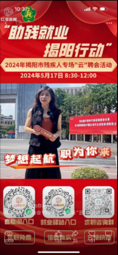 為體現(xiàn)揭陽(yáng)市“崇文、尚信、勤行、致遠(yuǎn)”的城市精神,讓更多揭陽(yáng)的殘疾人員感受到城市的溫暖、開放、包容,更好地為殘障人士解決“務(wù)工難”、“就業(yè)難”的現(xiàn)實(shí)問(wèn)題,揭陽(yáng)市殘疾人聯(lián)合會(huì)與紅海人力集團(tuán)揭陽(yáng)分公司聯(lián)合開展【助殘就業(yè)揭陽(yáng)行動(dòng)--2024年揭陽(yáng)市殘疾人專場(chǎng)“云”聘會(huì)活動(dòng)】,進(jìn)一步滿足揭陽(yáng)市殘障人員的就業(yè)需求;通過(guò)直播攬才、云上招聘的方式為更多殘疾人求職者提供更廣闊的就業(yè)機(jī)會(huì)。“直播帶崗云招聘會(huì)”是更為接地氣的招聘和求職平臺(tái),可以直觀地展現(xiàn)企業(yè)環(huán)境和企業(yè)文化,精準(zhǔn)傳遞用工需求和崗位要求,進(jìn)一步拓寬就業(yè)與服務(wù)渠道,有效推進(jìn)解決求職難和就業(yè)難問(wèn)題。具體活動(dòng)開展情況如下: