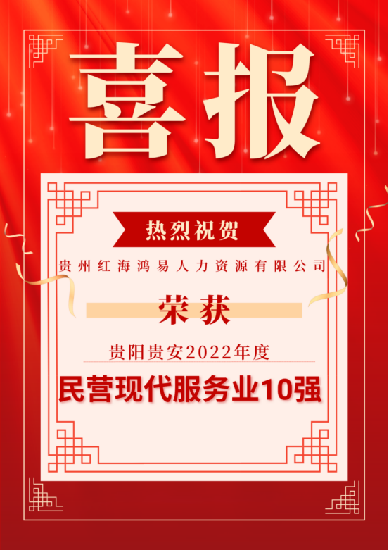 2023年7月27日,貴陽貴安推動(dòng)民營經(jīng)濟(jì)質(zhì)量發(fā)展大會(huì)在貴陽會(huì)議中心隆重召開,貴州省委常委、貴陽市委書記胡忠雄,貴陽市委副書記、貴陽市市長馬寧宇等領(lǐng)導(dǎo)發(fā)表講話。貴州紅海鴻易人力資源有限公司(簡稱貴州紅海)受邀參加,并喜獲貴陽市2022年度民營現(xiàn)代服務(wù)業(yè)十強(qiáng)。