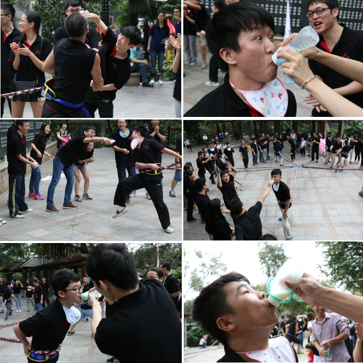 力量的對(duì)決堪稱(chēng)本次比賽的重頭戲,5隊(duì)分別派出了各自的重量級(jí)選手參賽。腰系繩帶,花樣式散開(kāi)狀,各隊(duì)參賽選手向著指定奶瓶使勁靠近、再靠近,運(yùn)用力量完成目標(biāo)接近,奮力吮吸奶嘴,以最快的速度喝完牛奶者為勝。前兩輪,E隊(duì)以絕對(duì)的優(yōu)勢(shì)完勝,后三輪A組黑馬反轉(zhuǎn)比賽格局,連勝三輪。其余隊(duì)伍,皆表現(xiàn)出默契配合,全力赴賽的團(tuán)隊(duì)精氣神。